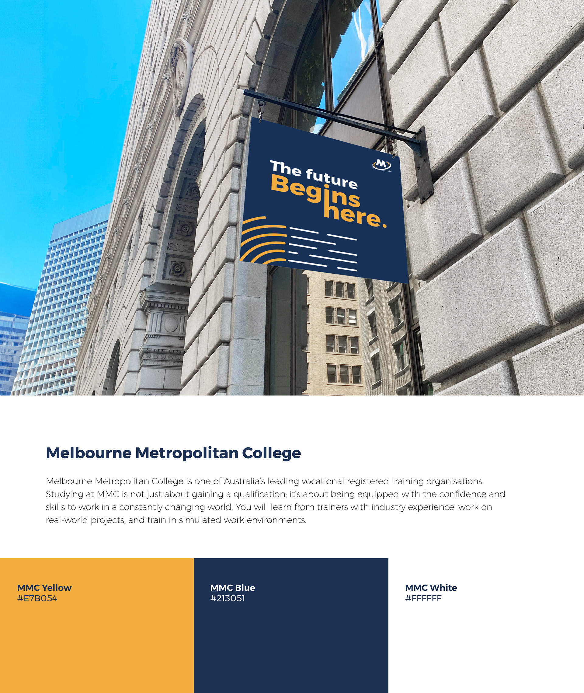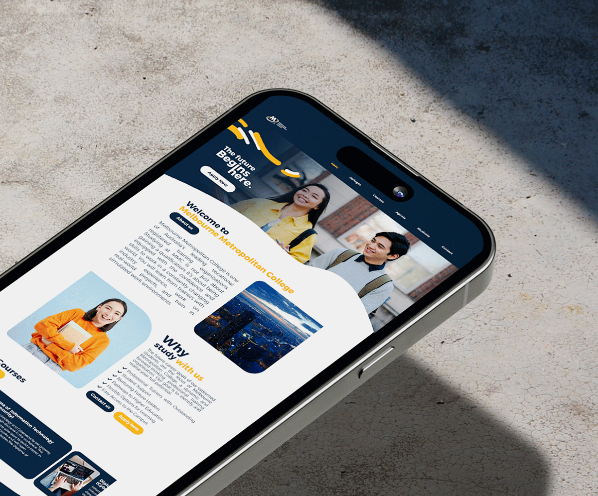 This rebranding project for Melbourne Metropolitan College aimed to modernise the visual identity whilst staying true to the company's original essence. The redesign preserves key elements that make the brand recognisable, while introducing modern typography, a refined colour palette and clean, cohesive visuals.